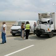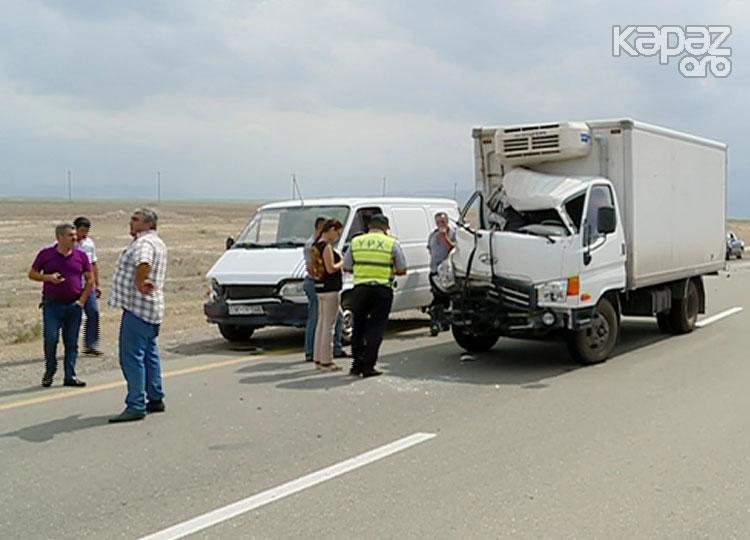 Sərnişin avtobusu hasara çırpıldı, Üç yük maşını toqquşdu