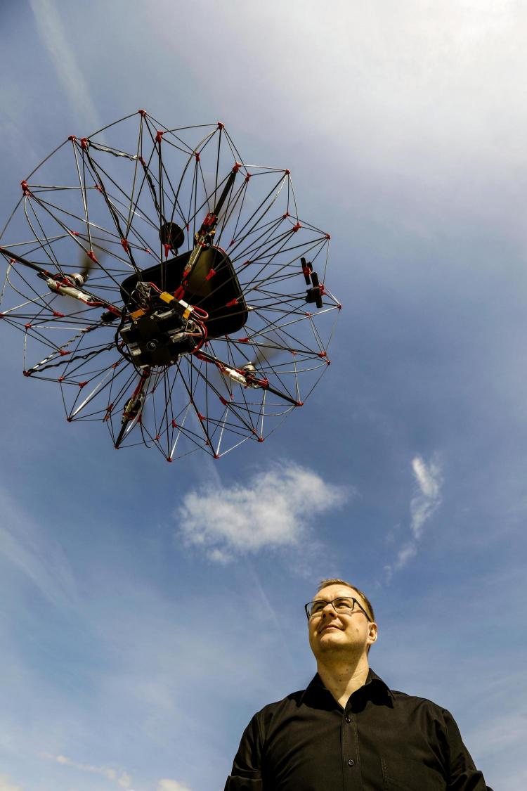 Lozannanın Federal politexnik məktəbinin mühəndisləri yükü zədələnmədən qoruyan qatlanan çərçivəli dron düzəldiblər. Bu quruluş insanların da zərər görməsini minimuma endirir. Dronun qatlanan çərçivəsi güclü karbon lif materialından hazırlanıb. Yük isə çərçivənin içərisində çexola bərkidilir. Əslində çərçivə o qədər böyük yer tutmur. Uçan qurğu maksimum 0,5 kq yük daşımaq iqtidarındadır. Ən uzağa uça biləcəyi məsafə isə 2 kilometrdir. Aparat maneələri müəyyən edən sistemlə təchiz olunub. Onun köməyilə müəyyənləşdirilən marşrut üzrə hərəkət edən dron ağaclardan və tikililərdən yayına bilir.