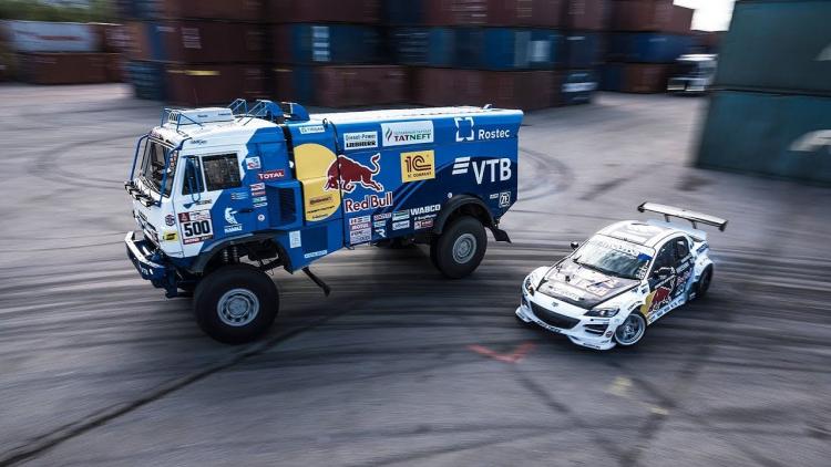 Ötən il Dakar ralli-reydində qalib gələn KAMAZ yük avtomobili kupe Mazda RX-8 yarış maşını ilə drift yarışa çıxıb. Red Bull şirkətinin yayımladığı videoda KAMAZı Eduard Nikolayev, Mazdanı isə zelandiyalı pilot Mayk Uiddett idarə edib. Drift gediş Sankt-Peterburqda yerləşən Kirov zavodunun ərazisində keçirilib. 9 tonluq KAMAZ təxminən 8 dəfə Mazdadan ağırdır. Yük maşının motor həcmi isə sportkupenin rotorlu aqreqatını 5 dəfə üstələyir. Amma at gücləri hər ikisində 1000-ə yaxındır.