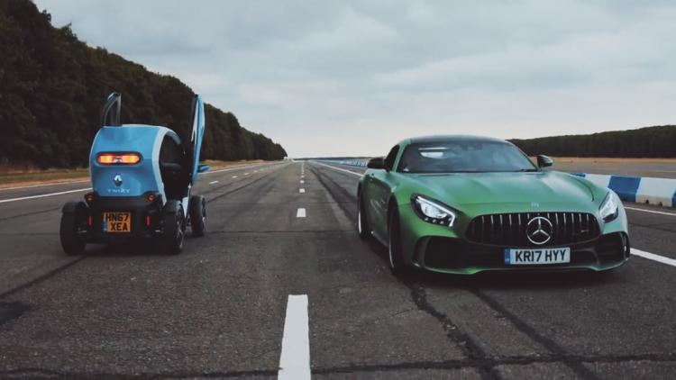 Top Gear jurnalı hardkor kupe Mercedes-AMG GT ilə Renault Twizy elektromobili arasında dreq yarış təşkil edib. Yarış qaydalarına əsasən sportkar arxa-arxaya getməli idi. Mercedes-AMG GT R 4 litrlik 585 at güclü tvin-turbo ilə təchiz olunub. Iki qapılı maşın düzünə maksimum 318 km/saat sürət yığır. Arxaya isə bu götərici 61 km/saata bərabərdir. Renault Twizy sitikarına gəldikdə, o 8 kilovatt saatlıq elektromotorla şütüyür. Yerindən 45 km/saat sürəti yığmaq üçün ona 6,1 saniyə lazımdır. 80 km/saat isə Twizy-nin ən yüksək sürətidir. Bir dəfəyə sitikar 100 kilometr məsafə qət edir.