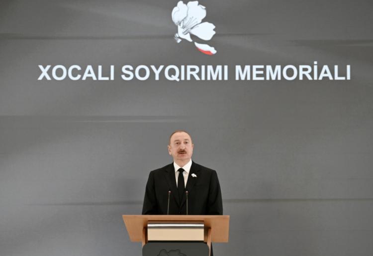 Prezident İlham Əliyev Xocalı Soyqırımı Memorial Kompleksinin açılışında çıxış edərək bildirib ki, Memorial Kompleksin açılışı ədalətin təntənəsidir və Xocalı soyqırımı milli yaddaşımızın bir hissəsidir. Dövlət başçısı Azərbaycanın səyləri nəticəsində artıq 20-yə yaxın ölkənin Xocalı soyqırımını rəsmən tanıdığını deyib. O, qeyd edib ki, Xocalı soyqırımı heç vaxt unudulmamalıdır və bu faciəni törədənlər məhkəmə qarşısında cavab veriblər.Vətən müharibəsi Ermənistan üçün dərs olmadı və 2023-cü ilin antiterror əməliyyatı Azərbaycanın iradəsini bütün dünyaya göstərdi.Prezident "Son 80 il ərzində bizim qədər tam və mütləq qələbə qazanmış ikinci dövlət olmamışdır dünyada. Bu gün biz sülh içində yaşayırıq və bunun təminatçısı Azərbaycan dövlətidir, bizim siyasətimizdir.Azərbaycan dövləti güclü və özünü müdafiə etməyə qadirdir" deyib.