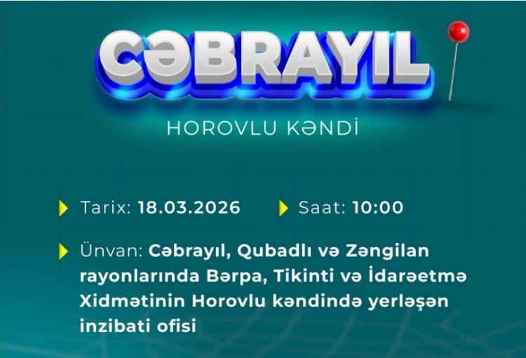 Əmək və Əhalinin Sosial Müdafiəsi Nazirliyinin məlumatına görə, martın 18-i, saat 10:00-da Cəbrayıl rayonunun Horovlu kəndində növbəti əmək yarmarkası keçiriləcək.Tədbir Cəbrayıl, Qubadlı və Zəngilan rayonlarında Bərpa, Tikinti və İdarəetmə Xidmətinin Cəbrayılın Horovlu kəndində yerləşən inzibati ofisində təşkil olunacaq.Yarmarkada hörgüçü, rəngsaz, elektrik köməkçisi, yol mühəndisi, üzlükçü, sürücü, qaynaqçı və s. üzrə vakansiyalar təqdim olunacaq.