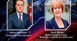 Xarici işlər naziri Ceyhun Bayramovun Böyük Britaniyanın Avropa Qonşuluğu və Amerika bölgəsi üzrə dövlət naziri Vendi Morton ilə telefon danışığı baş...
